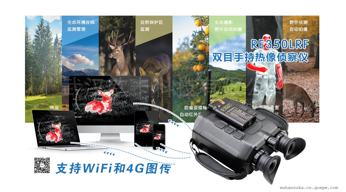 RE350LRF激光测距型双目手持热像仪内置激光测距模块,支持激光测距。并且可搭载4G图传模块,实现观测画面实时回传到平台。良好的红外成像效果、体积小巧轻便、功耗低、操控简洁、外型结构轻巧便携和良好的握持手感。该产品配备了优质的橡胶软套,根据人体手型进行了优化设计,使得用户有很好的单双手持握的体验。产品强化了防水设计,达到IP67 的防护等级。