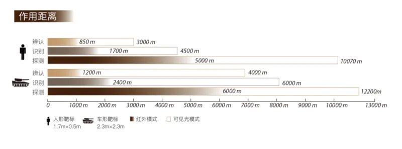 红外模式 可见光模式 人(1.7x0.5m) 辨别 850m 3000m 识别 1700m 4500m 探测 5000m 10070m 车(2.3x2.3m)