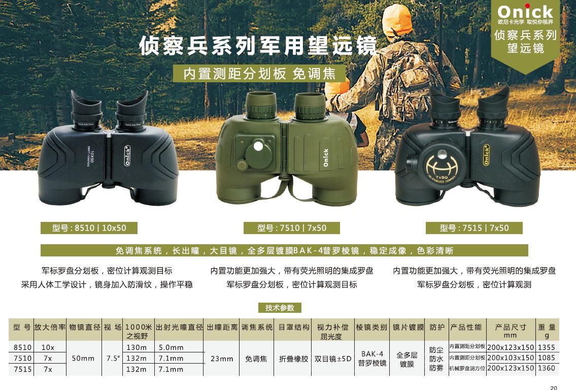 品牌:欧尼卡 型号:侦察兵8510 加工定制:是 放大倍数:8倍 出瞳距离:23 出瞳直径:5.0 视场:7.5