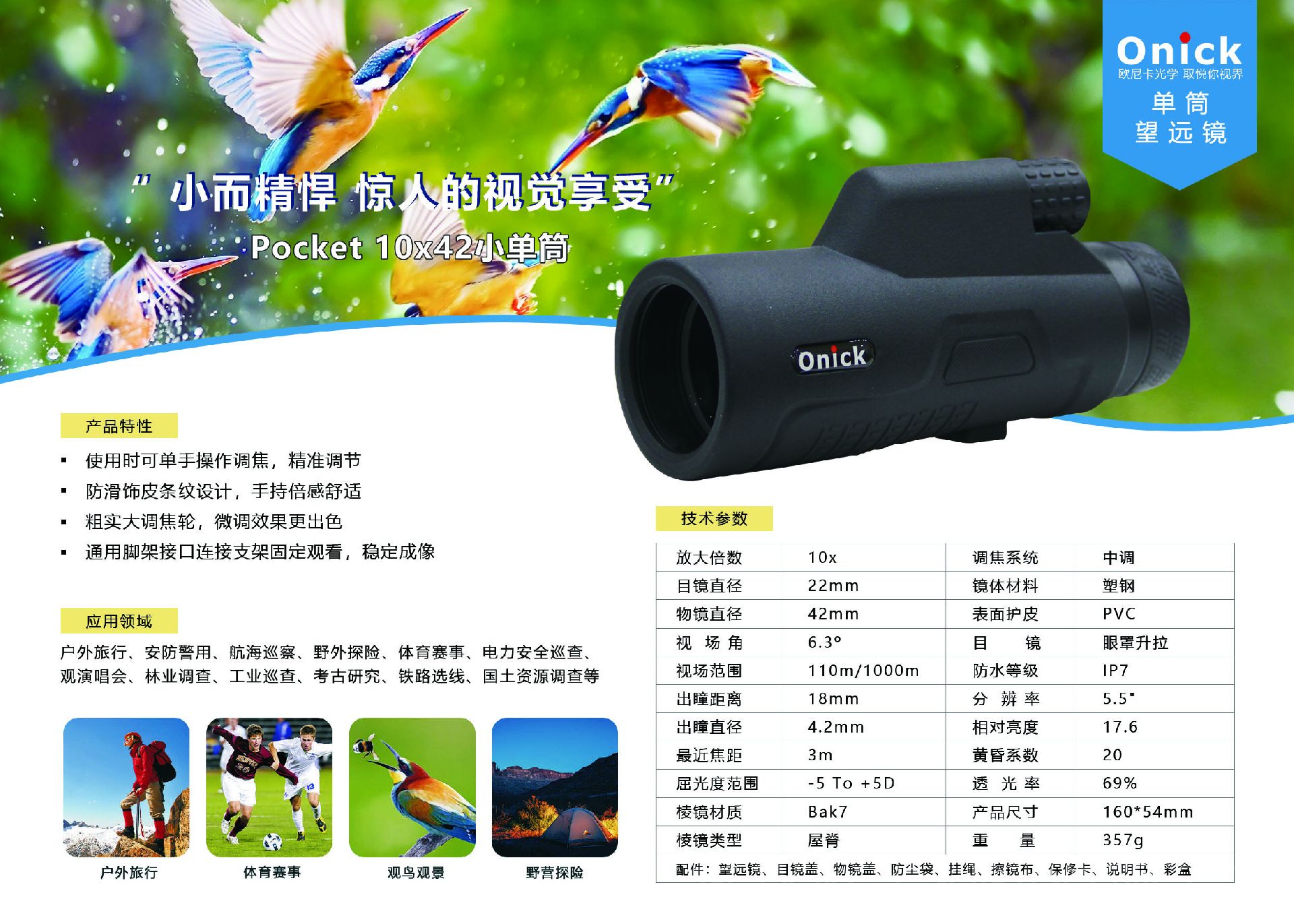 Onick 全新推出的高性价比Pocket 10X42小单筒望远镜,外观小而精悍,仅重357克,轻便、便携,可以将它放在夹克的口袋或手包里。可用于体育赛事,剧场或户外,即使是*小的细节也能被观察到,不管你是观察芦苇上的蜻蜓还是很远的鸟类,没有什么东西能够逃离它的目光。
